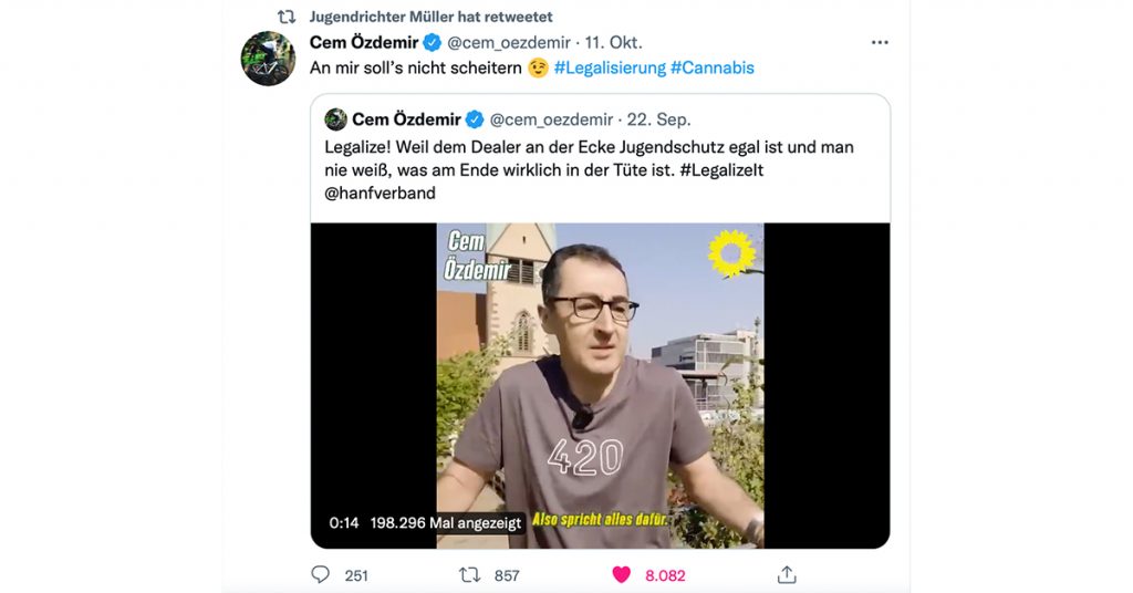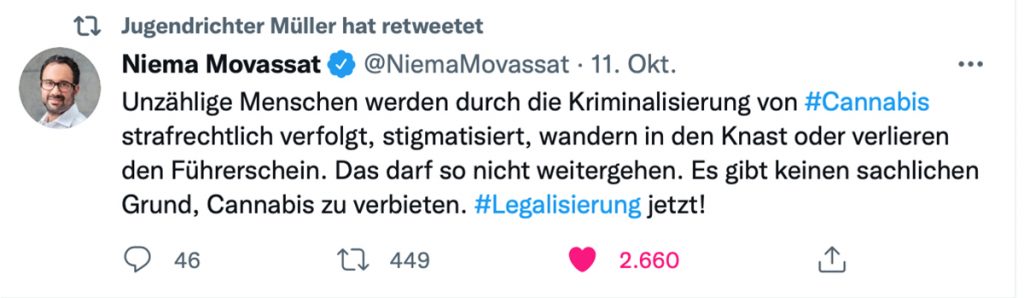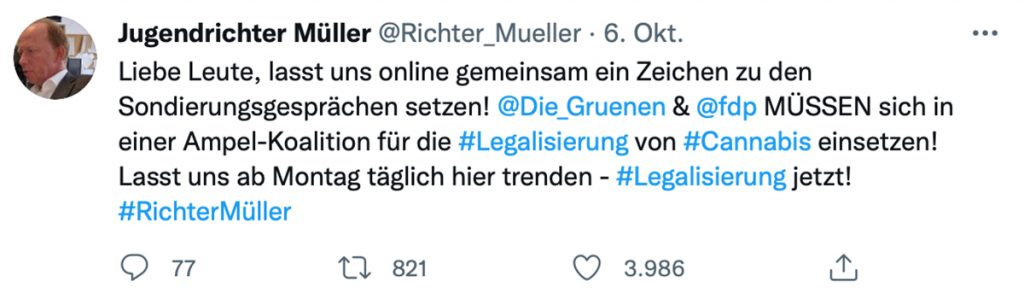 Unter den Hashtags #RichterMüller #ZeitfürLegalisierung und #CannabisLegalisierung trendet der Bernauer Jugendrichter seit über zwei Wochen auf Twitter. Und sein Engagement um die Legalisierung von Cannabis scheint sich auszuzahlen: In der möglichen Ampelkoalition sieht er gute Chancen für die Durchsetzung für ein bestimmtes Vorhaben der Grünen. Wie alles anfing, erfahrt ihr hier.