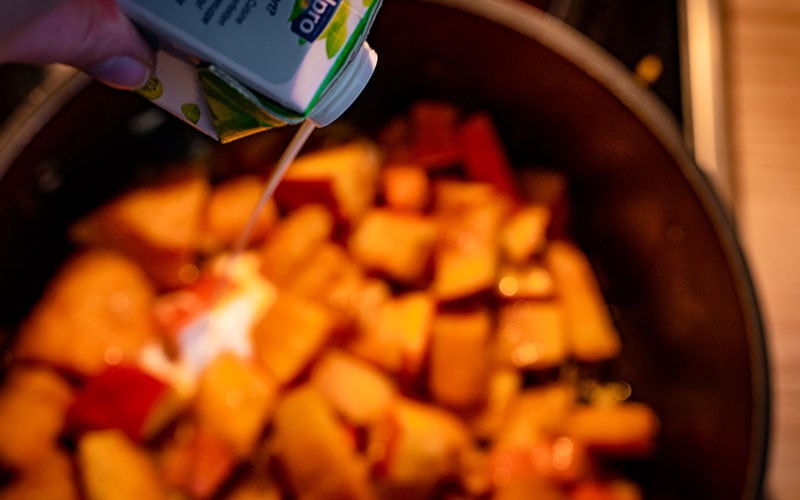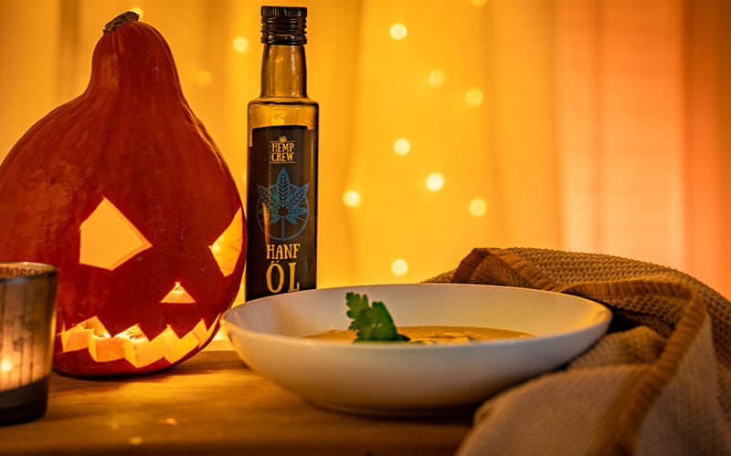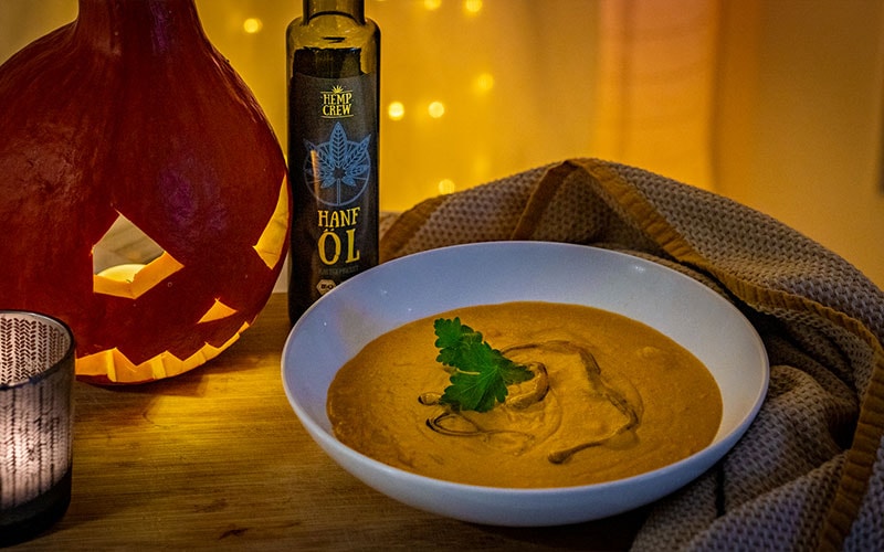 Halloween steht vor der Tür! Traditionell schmeißen sich an diesem Tag alle in gruselige Kostüme und Kinder ziehen für Süßigkeiten um die Häuser. Kürbisse gibt es derzeit überall zu kaufen und sie sind der perfekte Horror-Schmaus für den Tag der Tage. Zuerst wird geschnippelt: Den Kürbis in grobe Stücke schneiden, die Zwiebel würfeln und den Knoblauch fein hacken. Nun gibst du zuerst die Zwiebeln in einen Topf in das heiße Olivenöl. Schön scharf anbraten, die Stückchen dürfen gern ein bisschen braun werden fürs Aroma. Dann den Knoblauch kurz mit anschwenken und danach die Kürbisstückchen und den Agavendicksaft dazugeben. Sie werden ebenfalls angebraten, bis sie braune Röststellen bekommen. Mit Soja-Cuisine und Gemüsebrühe ablöschen und circa 20 Minuten auf niedriger Stufe leicht köcheln lassen, bis der Kürbis weich ist. Jetzt wird püriert, bis die Suppe eine cremige Konsistenz bekommt. Zum Schluss fehlt deinem Gericht nur noch ein bisschen Würze, hier kannst du ganz nach deinem Belieben abschmecken. Die Suppe anrichten und mit dem Hanföl toppen – der intensive Geschmack rundet das Gericht wundervoll ab. Happy Halloween!