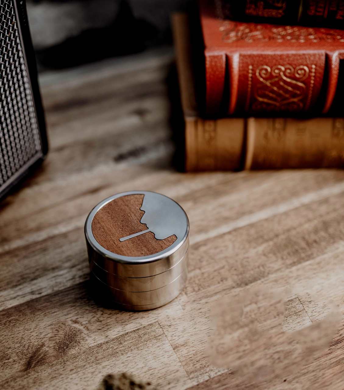 4-teiliger Edelstahl Grinder mit Mahagoniholz Innovatives Schneidesystem Inkl. Pollen-Pinsel mit Weedo Schriftzug Mit Echtheitszertifikat & Seriennummer Maße: 59 x 40 mm Gewicht: 300 Gramm