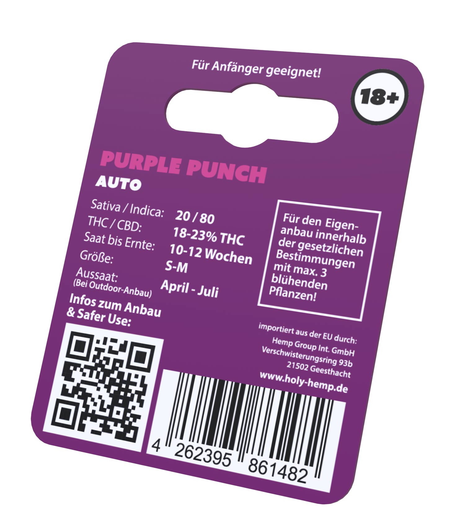 Auto Flowering 20% Sativa / 80% Indica 18-23% THC Saat bis Ernte: 10-12 Wochen Größe: S-M Aussaat (Bei Outdoor-Anbau): April-Juli Abstammung: Purple Punch (Alpha Cut) x Auto Cookies XL F4